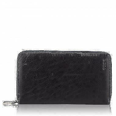 Мужское портмоне на полную купюру изготовлено из натуральной кожи, закрывается на молнию. Классический стиль аксессуара выгодно сочетается с вместительностью. Внутри два отделения для купюр и кармашек для монет на молнии. В портмоне вмещается шестнадцать визиток или пластиковых карточек. Для внутренней отделки использована вставка из светло-серой кожи, приятно гармонирующая со строгим черным цветом изделия.